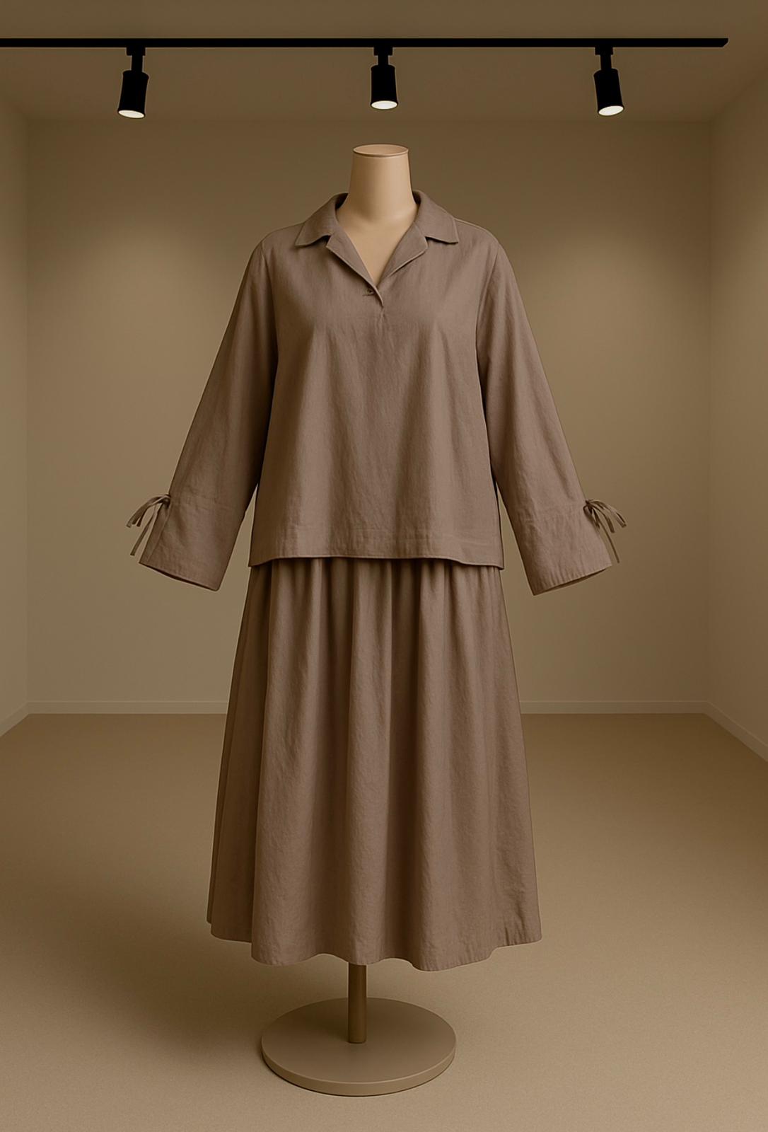 Deze prachtige two-piece set, gemaakt van 100% hoogwaardig katoen, combineert moeiteloze elegantie met ultiem draagcomfort. De luchtige blouse met subtiele kraag en strikdetails aan de mouwen geeft een verfijnde uitstraling, terwijl de soepelvallende rok zorgt voor een vrouwelijk en ontspannen silhouet.